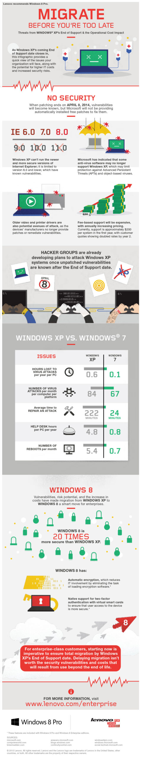 The infographic below, from PC manufacturer Lenova, gives a good overview of the consequences of not migrating to XP. However, what it doesn’t say is that many government and cash machine systems still use XP, so it will be interesting to see what impact the lack of support actually has.